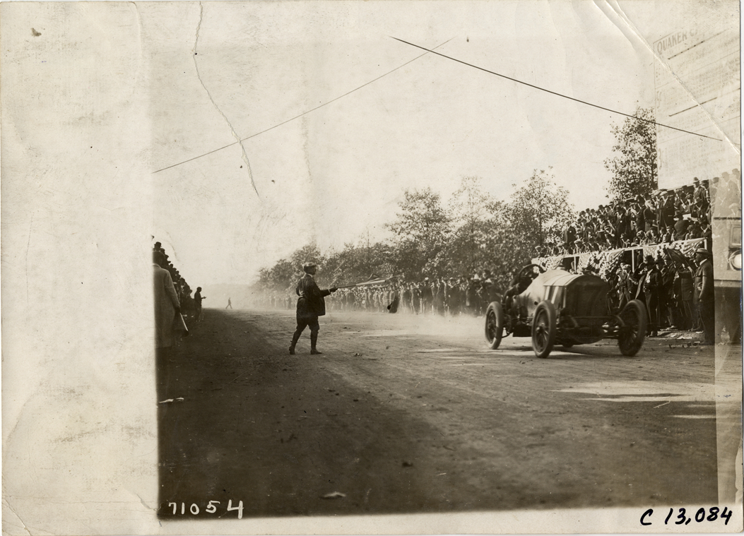 Spencer Wishart crossing finish line in Mercedes racecar, 1911 Fairmount Park races