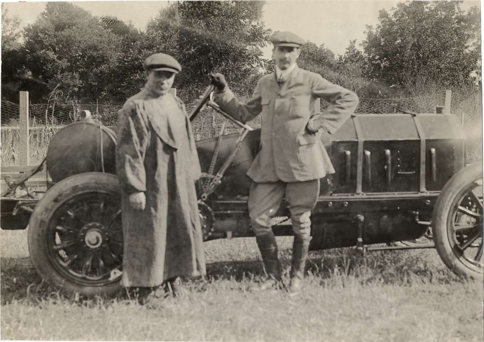 Drivers posing with racecar, 1908 Grand Prize races