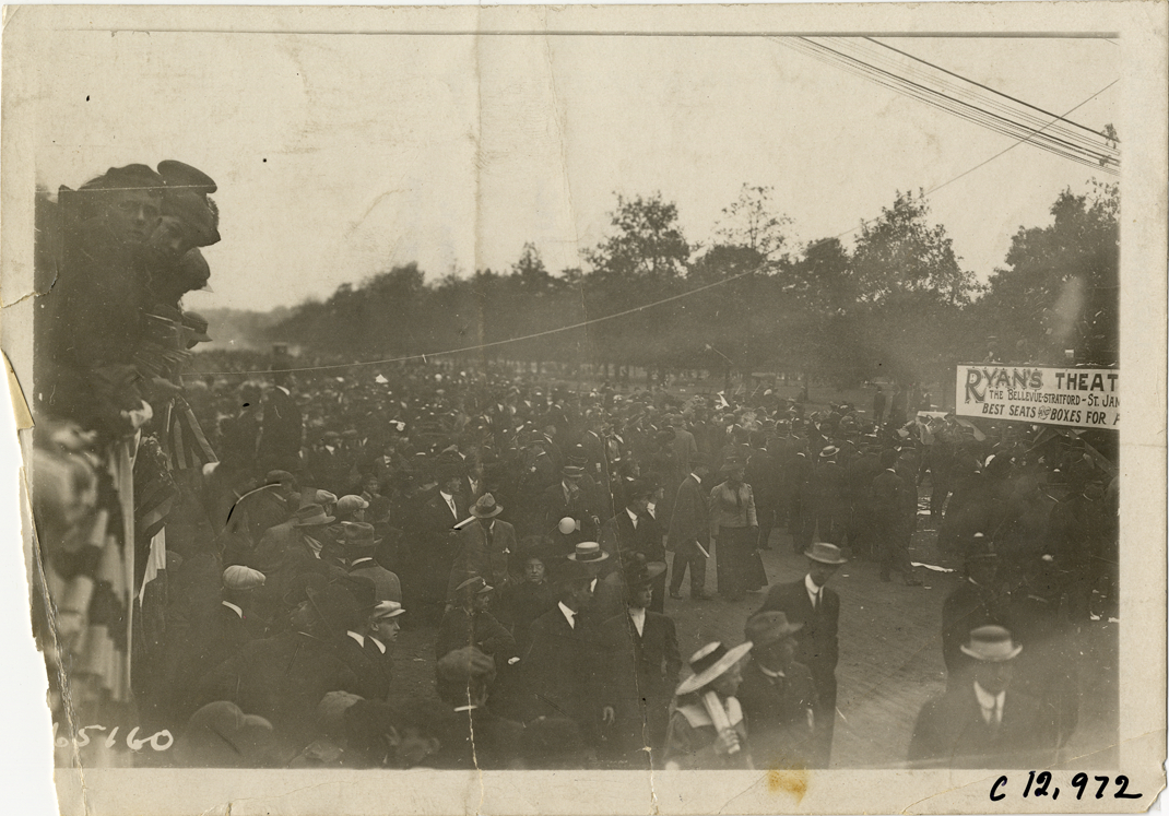 View of crowd standing on course near scoreboard during the 1910 Fairmount Park races in Philadelphia, Pennsylvania. Stamped on back: "Spooner & Wells, Inc., photographers, telephones 3472-3473 Columbus, 1931 Broadway, New York." Handwritten on back: "Races and racing--Fairmount Park races, 1910."