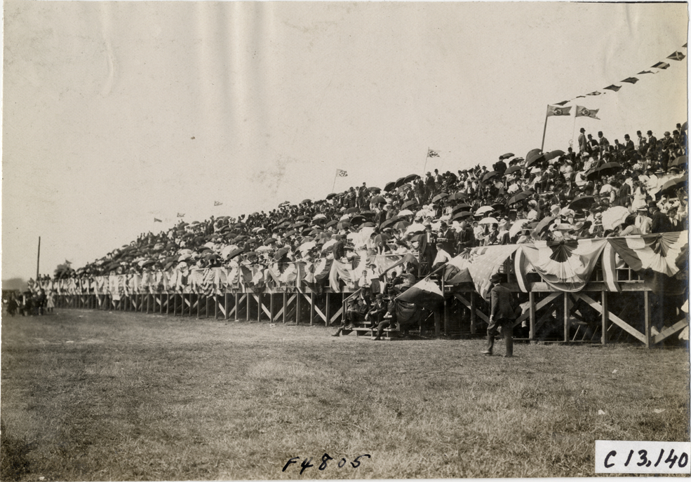 View of crowd sitting in bleachers during the 1908 Grand Prize races in Savannah, Georgia. Stamped on back: "Photo by N. Lazarnick, 29 West 42nd Street, N.Y., tel. 594 Bryant." Handwritten on back: "Races and racing--Grand Prize races, 1908."