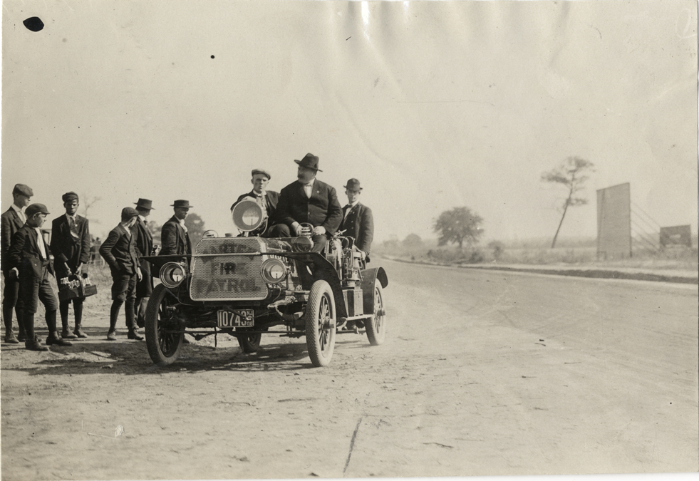 View of Savannah fire chief Thomas Ballantyne and two men in Marten Fire Patrol car during the 1908 Grand Prize races in Savannah, Georgia. Group of young men stand on roadside. Stamped on back: "Spooner & Wells, Inc., photographers, telephones 3472-3473 Columbus, 1931 Broadway, New York." Handwritten on back: "Races and racing--Grand Prize races, 1908."