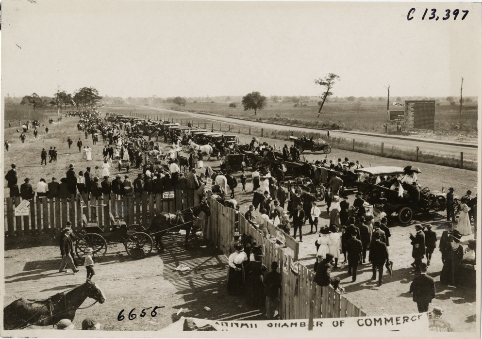 Bird's-eye view of spectators on roadside during the 1908 Grand Prize races in Savannah, Georgia. Cars are parked along road; fence, horse-drawn carriage and "Savannah Chamber of Commerce" banner in foreground. Handwritten on back: "Races and racing--Grand Prize races, 1908."