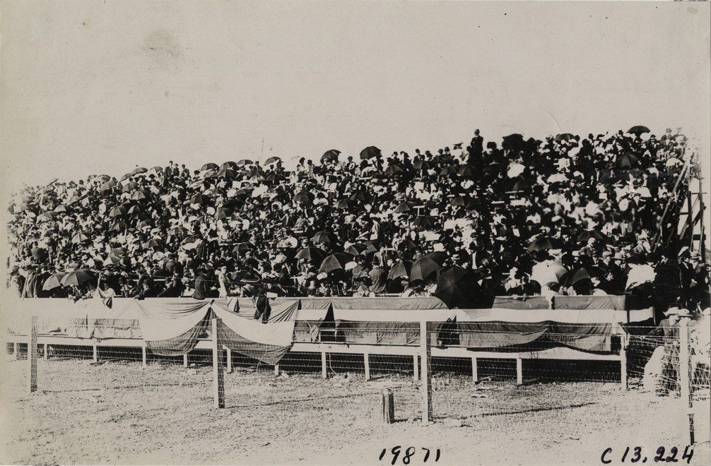 View of crowd of spectators in bleachers during the 1908 Grand Prize races in Savannah, Georgia. Stamped on back: "Photo by N. Lazarnick, 29 West 42nd Street, N.Y., tel. 594 Bryant." Handwritten on back: "View of grand stand. Races and racing--Grand Prize races, 1908."