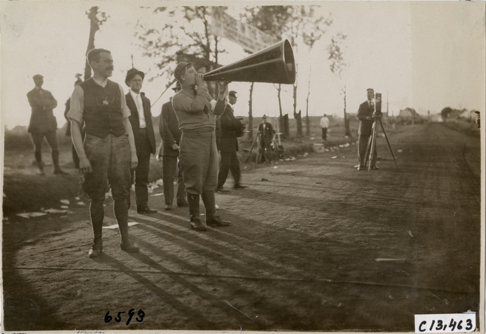 View of Fred Wagner standing with announcer speaking into megaphone on roadside during the 1908 Grand Prize races in Savannah, Georgia. Photographer with camera on tripod in background. Handwritten on back: "Races and racing--Grand Prize races, 1908."