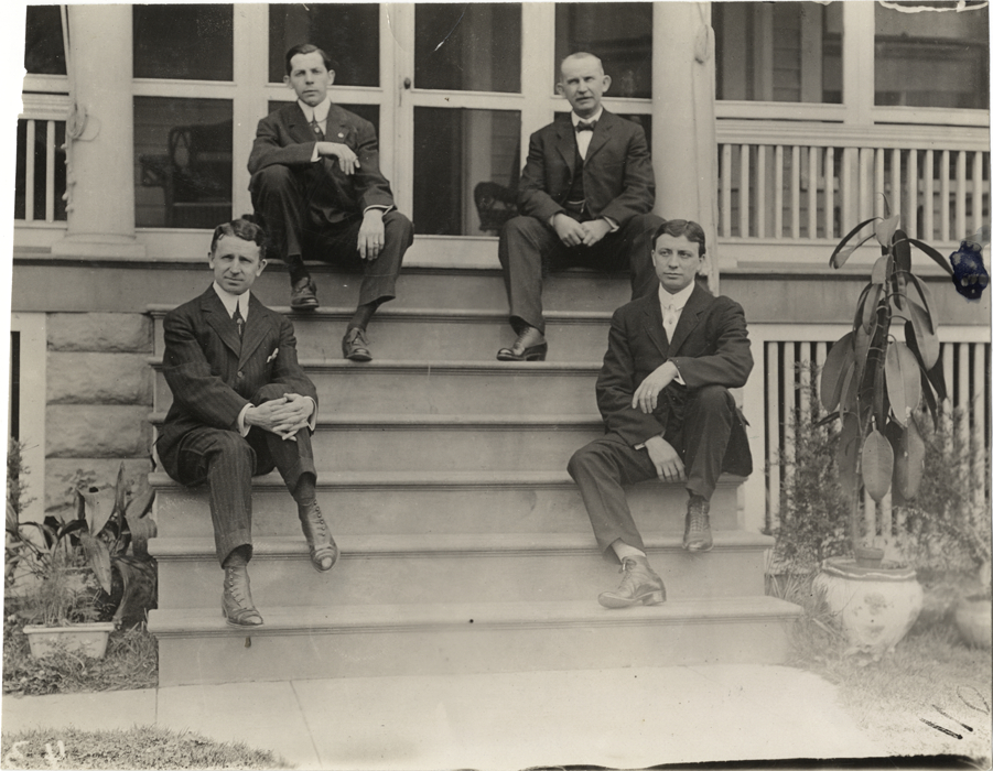 View of four unidentified men posing on porch steps during the 1908 Grand Prize races in Savannah, Georgia. Stamped on back: "Spooner & Wells, Inc., photographers, telephones 3472-3473 Columbus, 1931 Broadway, New York." Handwritten on back: "Races and racing--Grand Prize races, 1908."