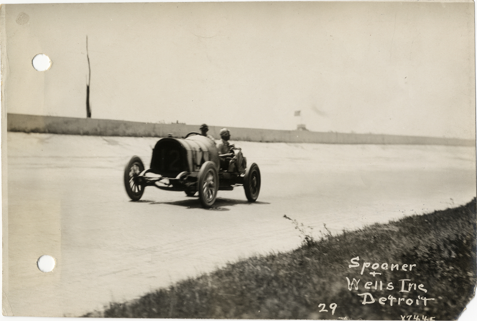 View of Howdy Wilcox and passenger racing Gray Fox car during the 1913 Indianapolis 500 automobile races at the Indianapolis Speedway in Indiana. Printed on front: "Spooner & Wells, Inc., Detroit." Stamped on back: "Spooner & Wells, Inc., photographers, 1231 Woodward Ave., Detroit, Mich., telephone North 1745." Handwritten on back: "Wilcox in Fox on a curve, Ind. Race, 1913. Races and racing--Indianapolis 500, 1913."