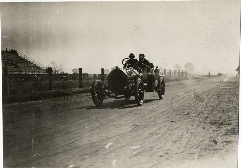 View of driver George Salzman and passengers racing Thomas Flyer car on course during the 1908 Grand Prize races in Savannah, Georgia. Handwritten on back: "Thomas Flyer, Salzman. Races and racing--Grand Prize races, 1908."