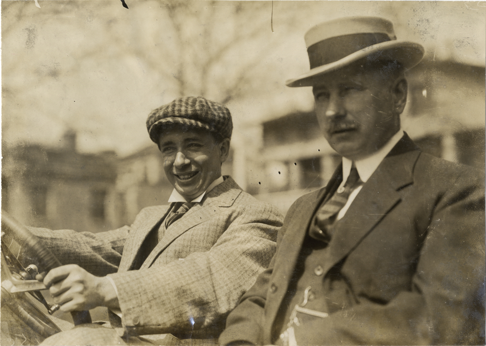 Close-up view of composer George Evans and Mr. Murray in car during the 1908 Grand Prize races in Savannah, Georgia. Handwritten on back: "Geo. Evans, composer, Mgr. Murray. Races and racing--Grand Prize races, 1908."