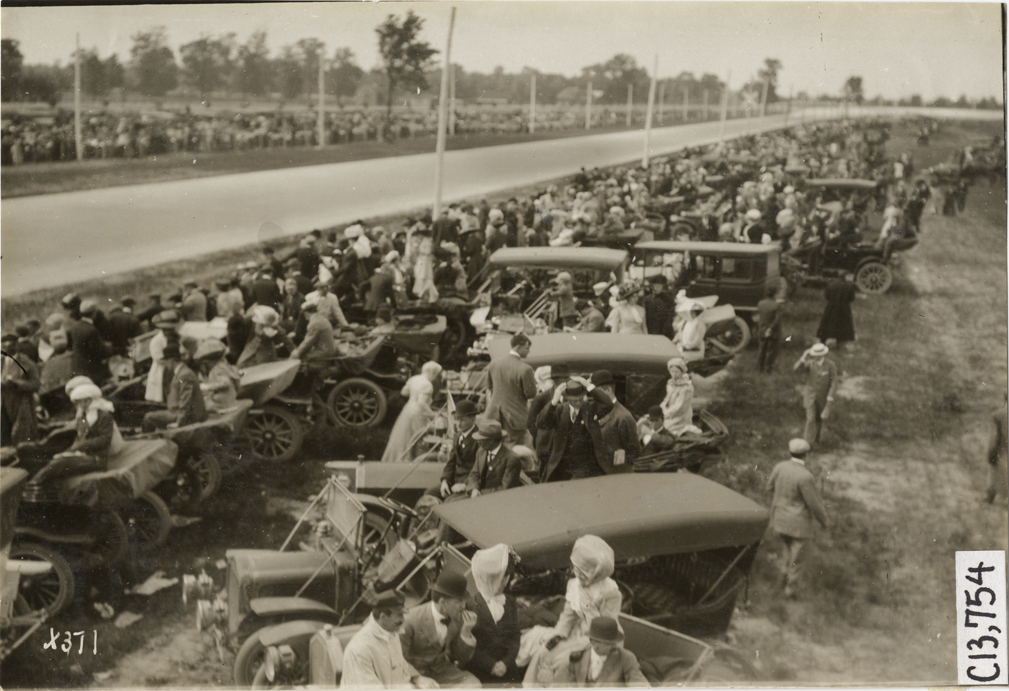 View of spectators, some with their cars, on side of track during the 1910 races at the Indianapolis Speedway in Indiana. Stamped on back: "Spooner & Wells, Inc., photographers, telephone North 1745. 1231 Woodward Ave., Detroit, Mich. Detroit, 1231 Woodward, New York, 1931 Broadway." Handwritten on back: "Races and racing--Indianapolis races, 1910."