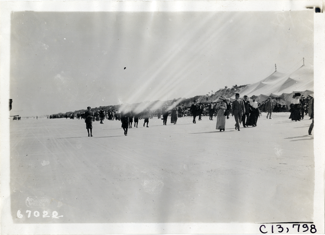 Spectators walking along beach, 1911 Jacksonville automobile races
