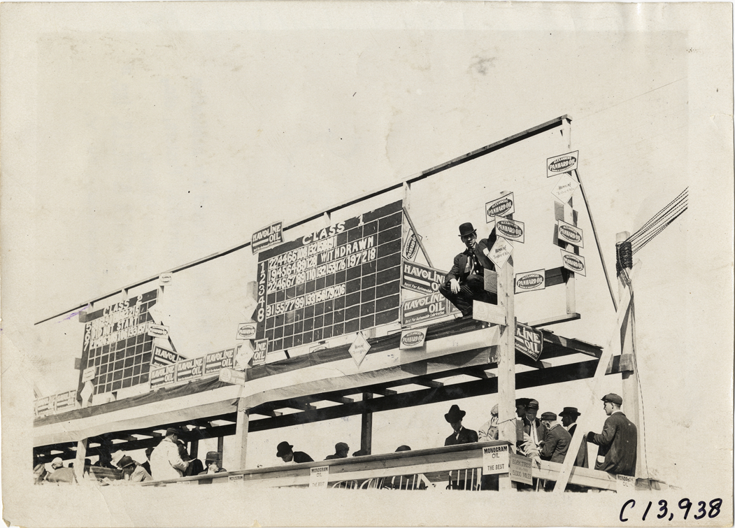 View of man crouching on platform next to scoreboards or tally boards during the 1909 Long Island Derby in New York. Railings are decorated with signs for Havoline oil and Panhard oil. Stamped on back: "Photo by Spooner & Wells, Inc. 1931 Broadway, N.Y." Handwritten on back: "Races and racing--Long Island Derby, 1909."