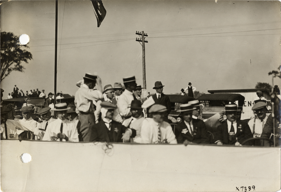View of spectators in official visitors stand during the 1913 Indianapolis 500 automobile races at the Indianapolis Speedway in Indiana. Stamped on back: "Spooner & Wells, Inc., photographers, 1231 Woodward Ave., Detroit, Mich., telephone North 1745." Handwritten on back: "Official stand, Ind. Race 1913. Races and racing--Indianapolis 500, 1913."