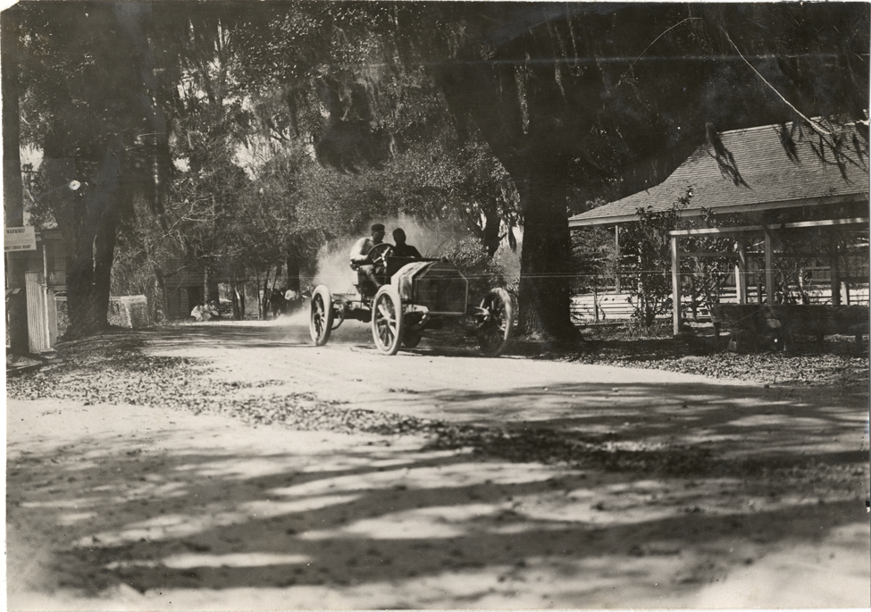 View of Frank Leland and passenger racing Stearns car no. 7 on course during the 1908 Grand Prize races in Savannah, Georgia. Handwritten on back: "Stearns, Leland. Races and racing--Grand Prize races, 1908."