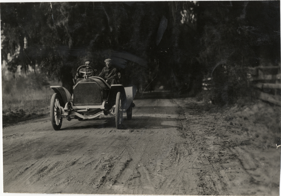 View of L.B. Lorimer and passenger in racecar during the 1908 Grand Prize races in Savannah, Georgia. Handwritten on back: "Lorimer. Races and racing--Grand Prize races, 1908."