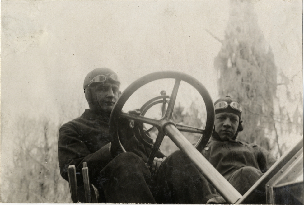 Al Poole and Tom Pepperday in Isotta-Fraschini racecar, 1908 Grand Prize races