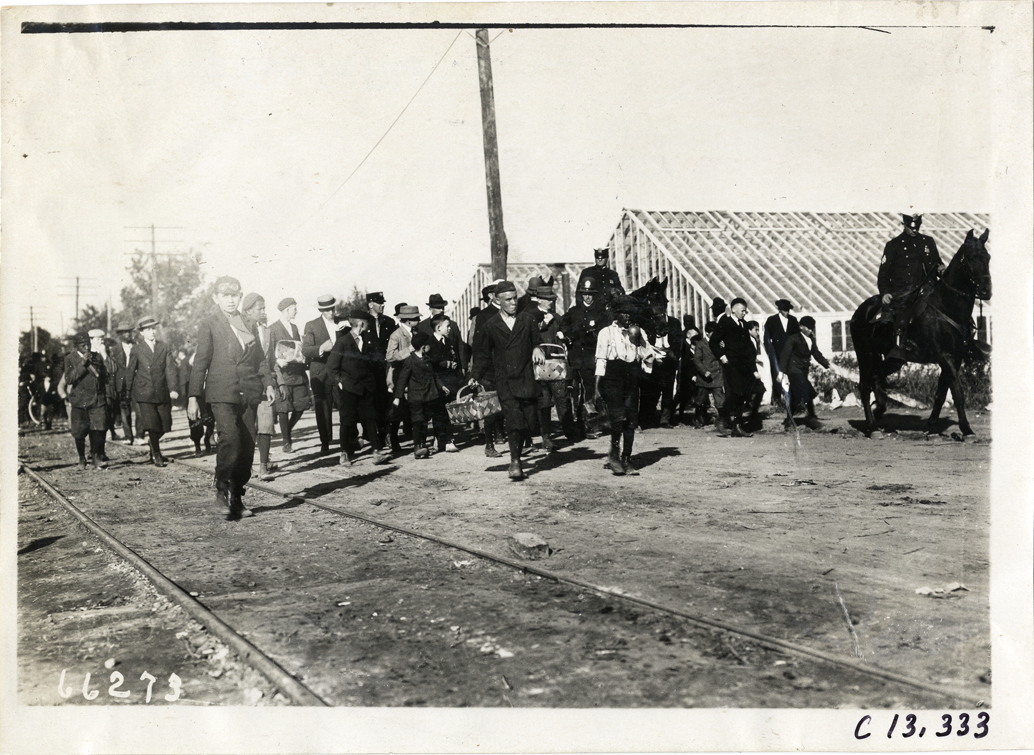 View of spectators walking along dirt road during the 1910 Grand Prize races in Savannah, Georgia. Mounted policemen on right; young man carrying two baskets in foreground. Houses under construction in background. Stamped on back: "Spooner & Wells, Inc., photographers, telephones 3472-3473 Columbus, 1931 Broadway, New York." Handwritten on back: "Races and racing--Grand Prize races, 1910."