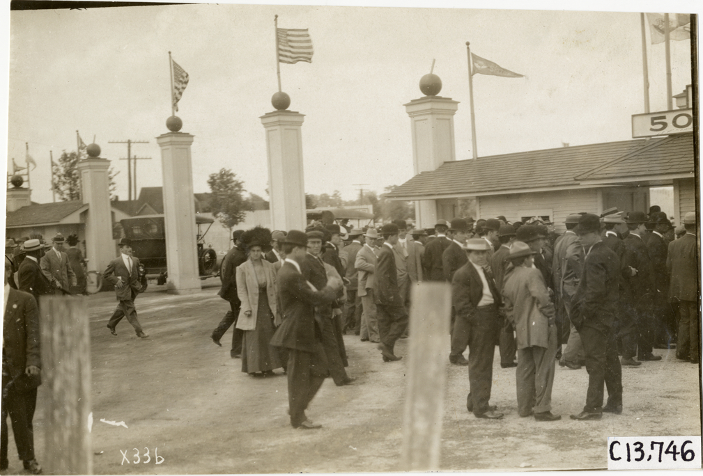 View of spectators at front gates during the 1910 races at the Indianapolis Speedway in Indiana. Handwritten on back: "At the gates. Races and racing--Indianapolis races, 1910."