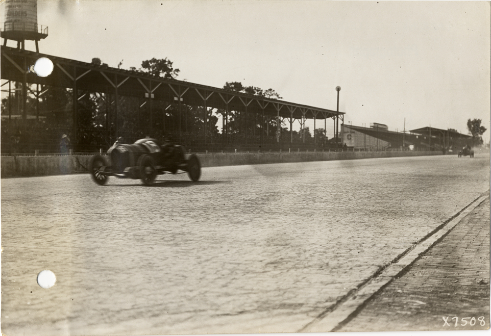 View of Johnny Jenkins racing Schacht car no. 18 in trial race during the 1913 Indianapolis 500 automobile races at the Indianapolis Speedway in Indiana. Handwritten on back: "Jenkins in Schacht #18 in trial race, Ind. Race 5/30/13. Races and racing--Indianapolis 500, 1913."