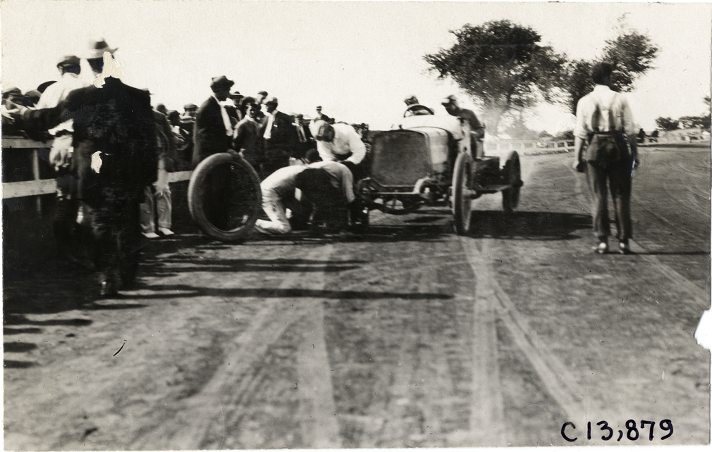 View of crew changing tire of racecar on side of track during the 1908 automobile races at the Elkwood Park racetrack in Long Branch, New Jersey. Stamped on back: "Spooner & Wells, Inc., photographers, telephones 3472-3473 Columbus, 1931 Broadway, New York." Handwritten on back: "Races and racing--Long Branch races, 1908."
