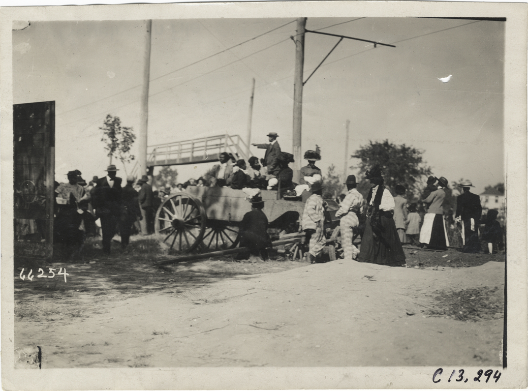 View of men and women watching automobile race from roadside during the 1910 Grand Prize races in Savannah, Georgia. Some spectators stand in wagon; two convicts, wearing striped uniforms, stand next to wagon. Pedestrian bridge in background. Printed on front: "Spooner, Wells." Stamped on back: "Spooner & Wells, Inc., photographers, telephones 3472-3473 Columbus, 1931 Broadway, New York." Handwritten on back: "Races and racing--Grand Prize races, 1910."
