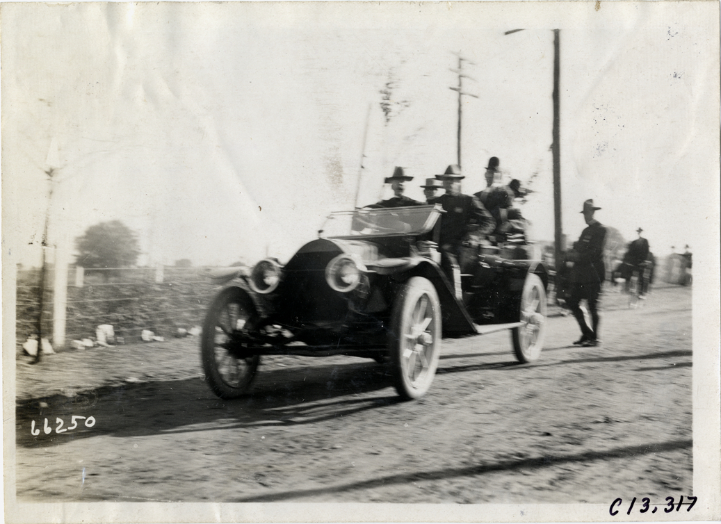 View of soldiers riding in car during the 1910 Grand Prize races in Savannah, Georgia. Stamped on back: "Spooner & Wells, Inc., photographers, telephones 3472-3473 Columbus, 1931 Broadway, New York." Handwritten on back: "Races and racing--Grand Prize races, 1910."
