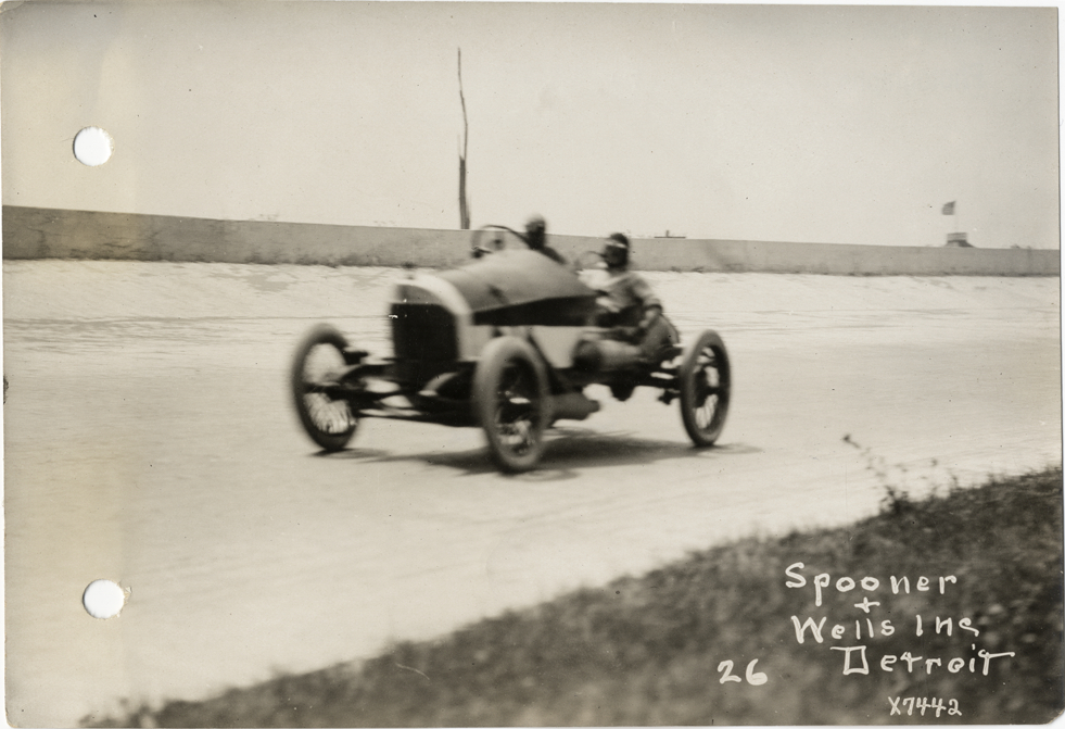 Spencer Wishart and passenger in Mercer racecar, 1913 Indianapolis 500 automobile race