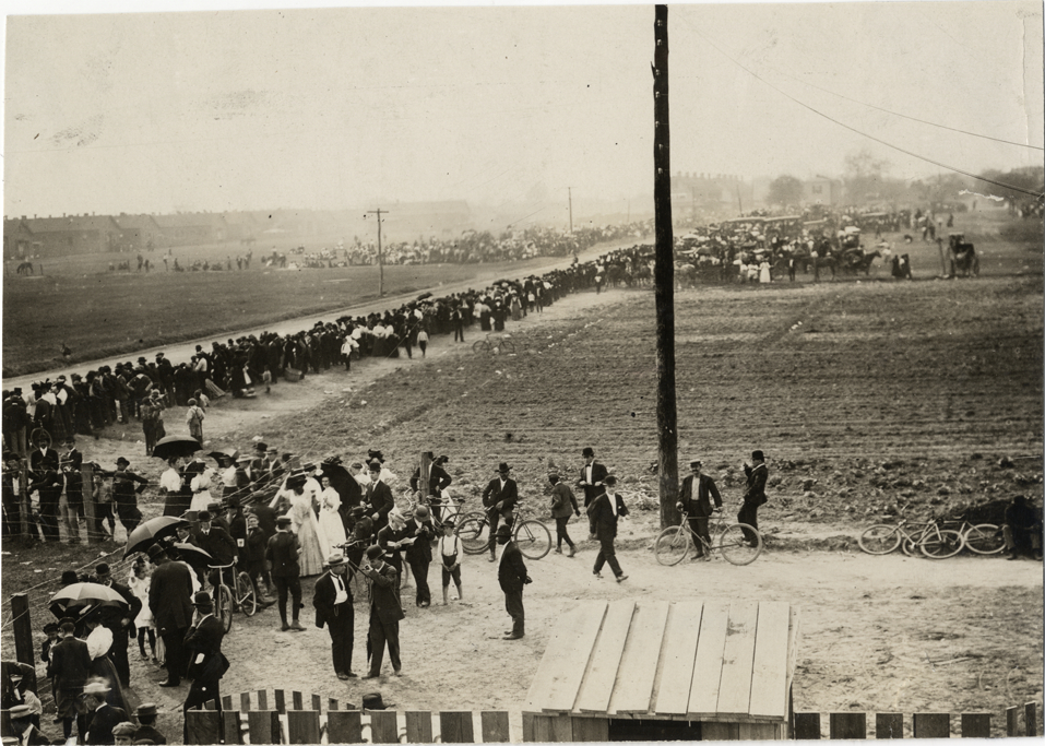 View of spectators on roadside, some with bicycles, during the 1908 Grand Prize races in Savannah, Georgia. Handwritten on back: "Races and racing--Grand Prize races, 1908."