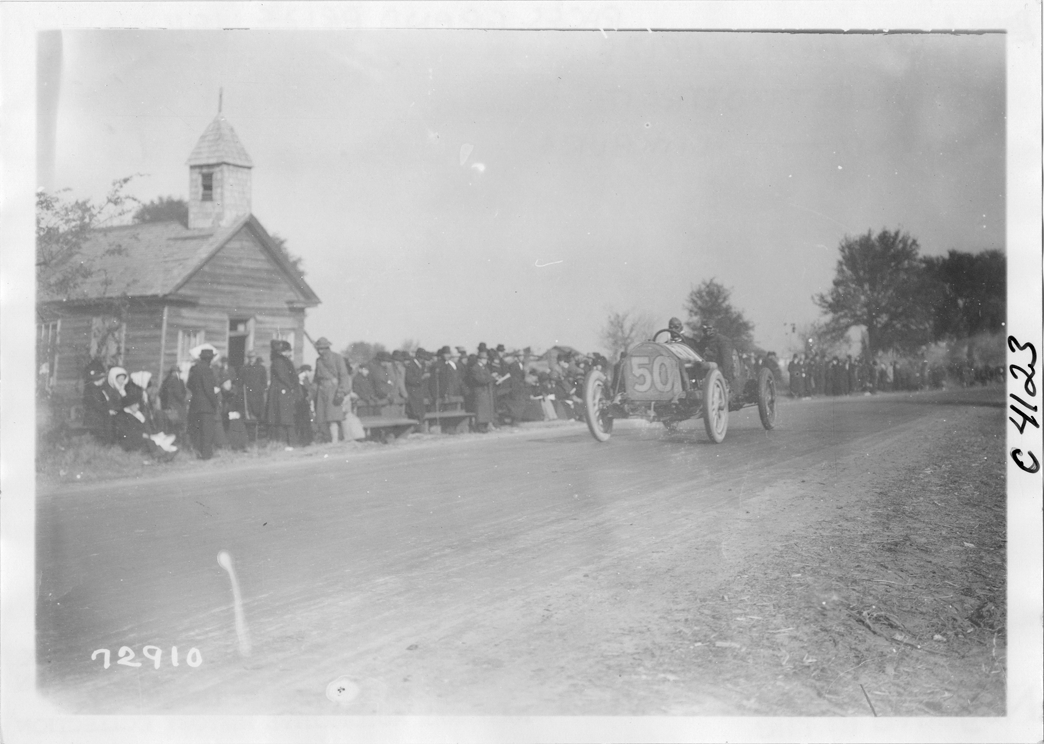 View of Limburg and passenger racing Abbott-Detroit car no. 50 past spectators on roadside during the 1911 Grand Prize races in Savannah, Georgia. Wooden-frame church in background. Handwritten on back: "Event, Grand Prize. #50 Abbott Detroit, driver, Limburg. Races and racing--Grand Prize races, 1911."