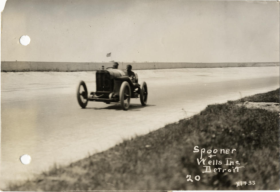 View of Jules Goux and passenger racing Peugeot car no. 16 during the 1913 Indianapolis 500 automobile races at the Indianapolis Speedway in Indiana. Printed on front: "Spooner & Wells, Inc., Detroit." Stamped on back: "Spooner & Wells, Inc., photographers, 1231 Woodward Ave., Detroit, Mich., telephone North 1745." Handwritten on back: "Goux in the lead, Ind. Race, 1913. Races and racing--Indianapolis 500, 1913."