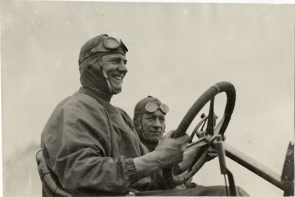 Joe Seymour and passenger in Simplex racecar, 1908 Grand Prize races