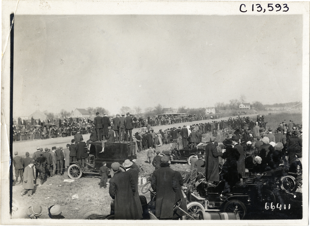 View of spectators, some with their cars, on roadside during the 1910 Guttenberg races in Guttenberg, New Jersey. Stamped on back: "Spooner & Wells, Inc., photographers, telephones 3472-3473 Columbus, 1931 Broadway, New York." Handwritten on back: "Races and racing--Guttenberg races, 1910."