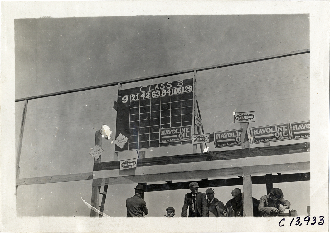 View of scoreboard or tally board during the 1909 Long Island Derby in New York. Platform is decorated with signs advertising Havoline oil and Panhard oil. Stamped on back: "Photo by Spooner & Wells, Inc. 1931 Broadway, N.Y." Handwritten on back: "Races and racing--Long Island Derby, 1909."