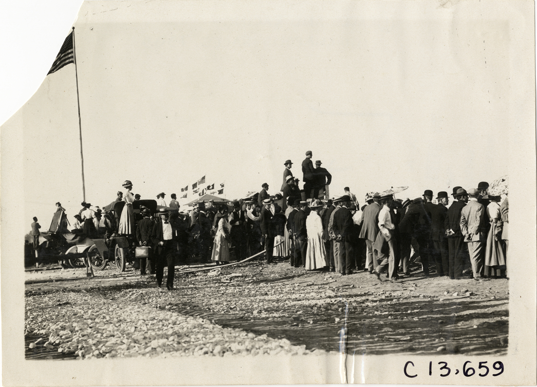 View of spectators, some with their cars, standing on side of track during the 1909 races at the Indianapolis Speedway in Indiana. Stamped on back: "Photo by Spooner & Wells, Inc. 1931 Broadway, N.Y." Handwritten on back: "Races and racing--Indianapolis races, 1909."