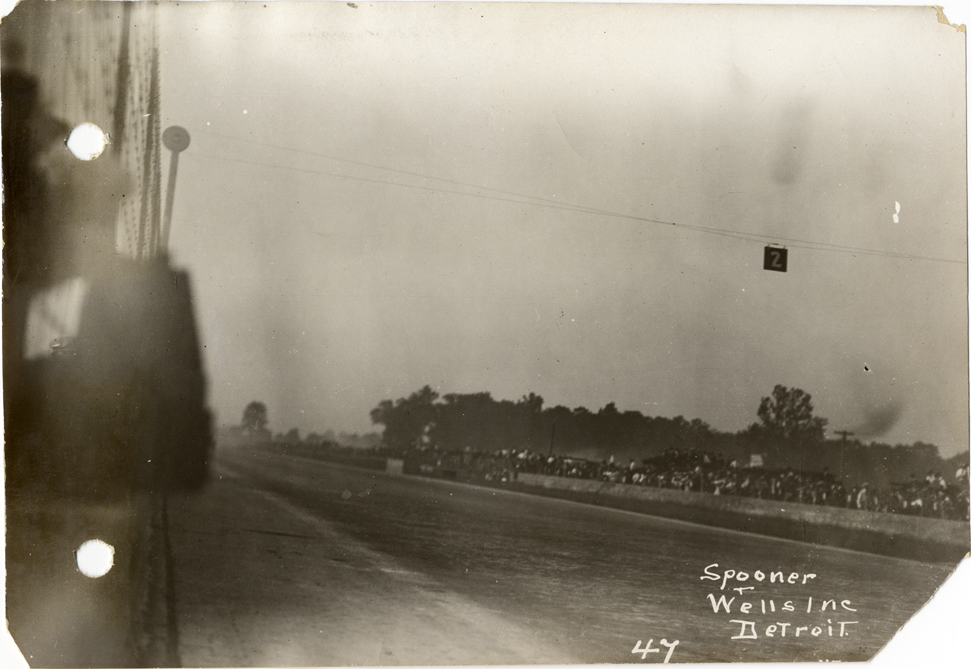 View of spectators on trackside during the 1913 Indianapolis 500 automobile races at the Indianapolis Speedway in Indiana. Printed on front: "Spooner & Wells, Inc., Detroit." Handwritten on back: "Indianapolis Race 1913, crowded grandstand. Races and racing--Indianapolis 500, 1913."