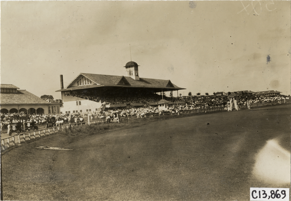 View of grandstand during the 1909 automobile races at the Elm Ridge racetrack in Kansas City, Missouri. Handwritten on back: "View of the grandstand, 7/31/09. Races and racing--Kansas City auto races, 1909."