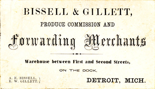 View of a business card for Bissell & Gillett. Printed on front: "Bissell & Gillett, produce commission and forwarding merchants. Warehouse between First and Second Streets, on the dock, Detroit, Mich. A.E. Bissell, E.W. Gillett."