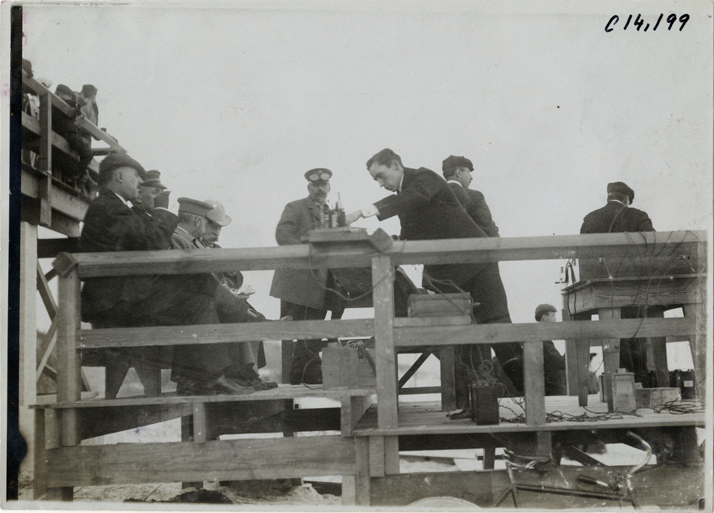 View of man setting up timing equipment in timers' stand during the 1905 Ormond-Daytona races in Florida. Handwritten on back: "Races and racing--Ormond-Daytona, 1905."