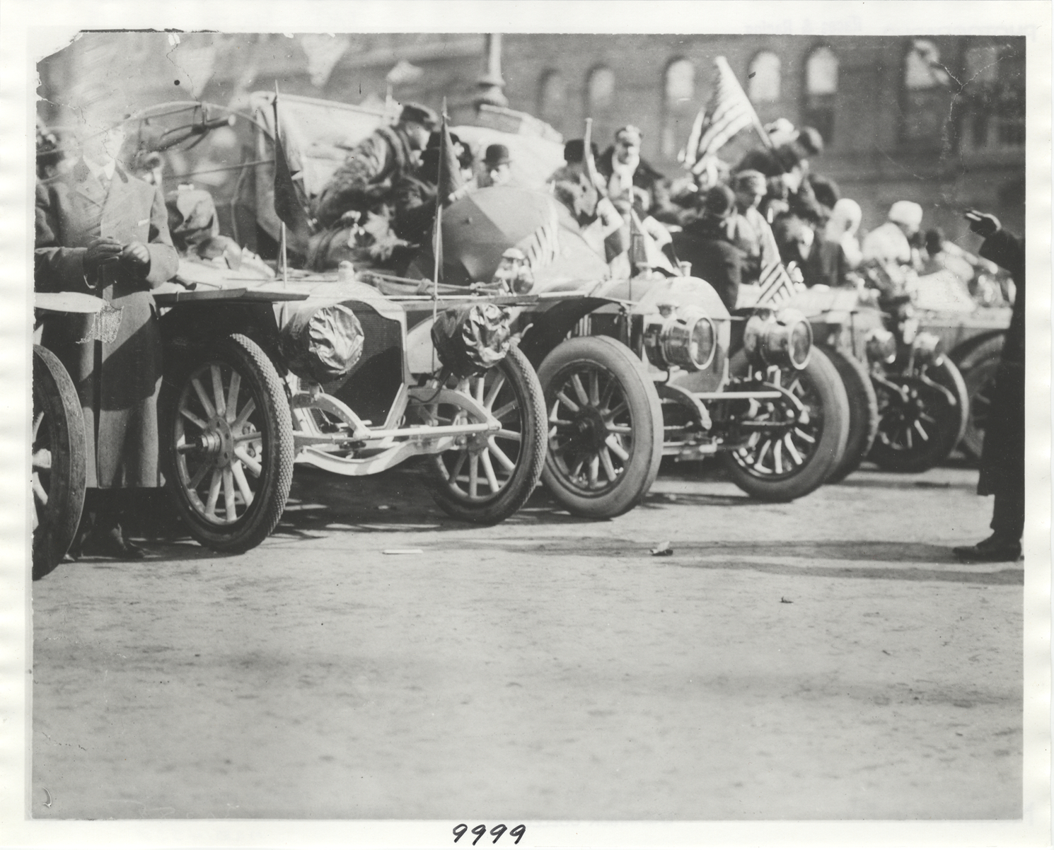 View of participating automobiles parked in row at the start of the 1908 New York to Paris Race. Handwritten on back: "Races and racing--New York to Paris, 1908."