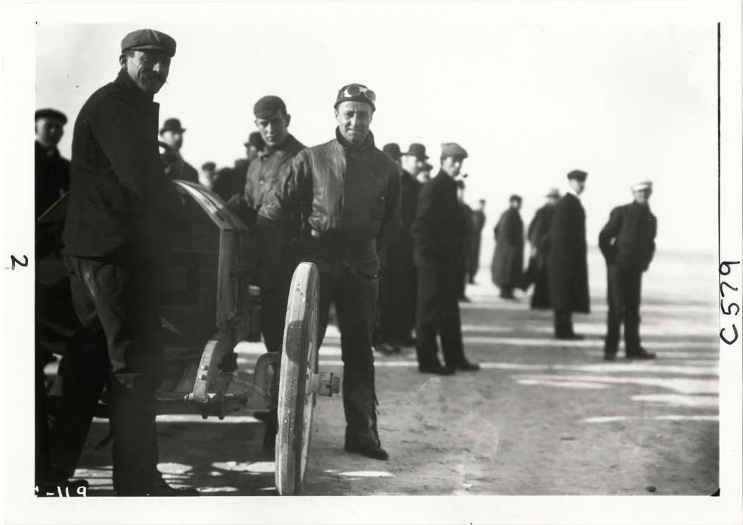 View of three men, possibly driver and crew, standing next to car on beach during the 1905 Ormond-Daytona races in Florida. Spectators in background. Handwritten on back: "Races and racing--Ormond-Daytona, 1905."