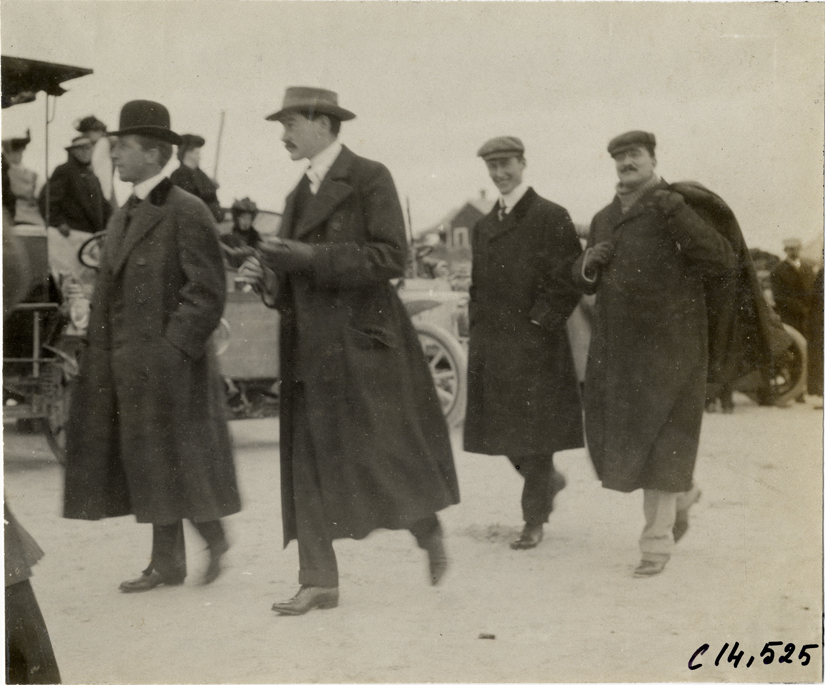 View of four men, wearing suits, overcoats and hats, walking on beach during the 1906 Ormond-Daytona races in Florida. Handwritten on back: "Races and racing--Ormond-Daytona, 1906."