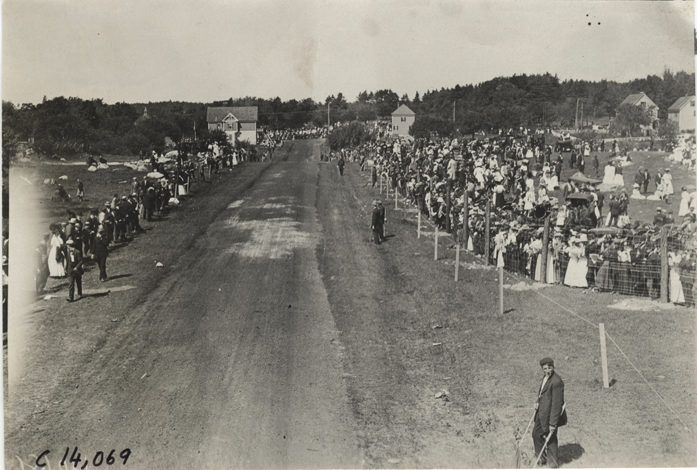 Bird's-eye view of spectators on roadside during the 1908 Lowell road race in Lowell, Massachusetts. Stamped on back: "Spooner & Wells, Inc., photographers, telephones 3472-3473 Columbus, 1931 Broadway, New York." Handwritten on back: "Races and racing--Lowell road race, 1908."