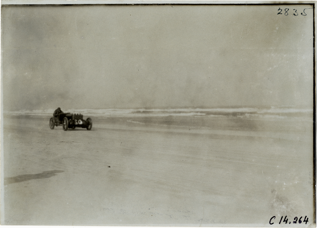 View of J. Walter Christie racing Christie car no. 30 on beach during the 1905 Ormond-Daytona races in Florida. Handwritten on back: "#30 60 h.p. Christie, entered by Walter Christie. Walter Christie starting his 40 second mile. Races and racing--Ormond-Daytona, 1905."