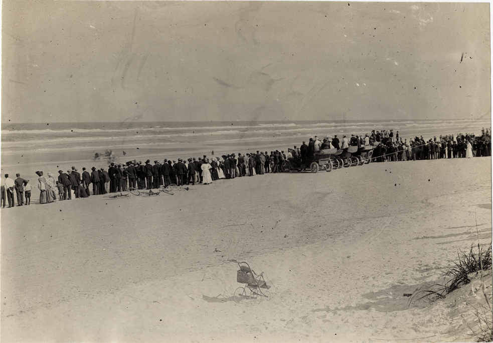 View of spectators, some with cars, on beach during the 1908 Ormond-Daytona races in Florida. Handwritten on back: "Races and racing--Ormond-Daytona, 1908."