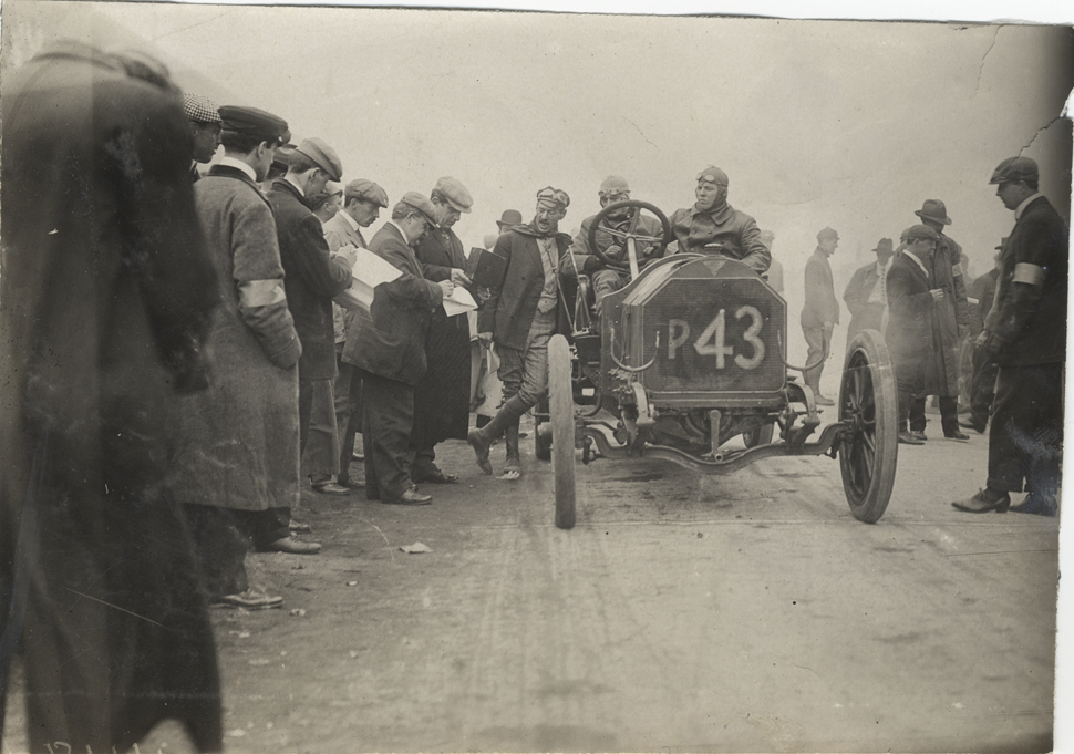 View of Fred Wagner standing next to driver and passenger in car no. P43 during the 1908 Long Island Sweepstakes in New York. Other racing officials stand nearby. Stamped on back: "Spooner & Wells, Inc., photographers, telephones 3472-3473 Columbus, 1931 Broadway, New York." Handwritten on back: "Races and racing--Long Island Sweepstakes, 1908."