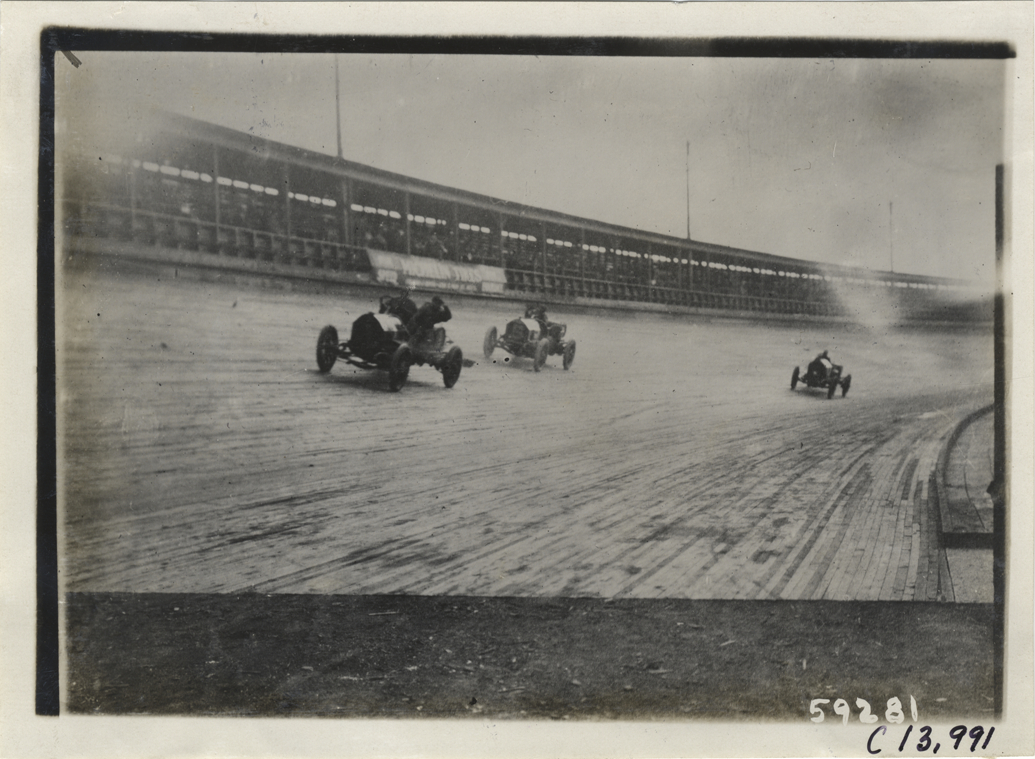 View of cars racing on track during the 1910 Los Angeles races at the Los Angeles Motordrome in California. Stamped on back: "Spooner & Wells, Inc., photographers, telephones 3472-3473 Columbus, 1931 Broadway, New York." Handwritten on back: "Races and racing--Los Angeles races, 1910."