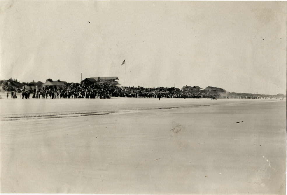View of spectators on beach during the 1908 Ormond-Daytona races in Florida. Stamped on back: "Spooner & Wells, Inc., photographers, telephones 3472-3473 Columbus, 1931 Broadway, New York." Handwritten on back: "Races and racing--Ormond-Daytona, 1908."