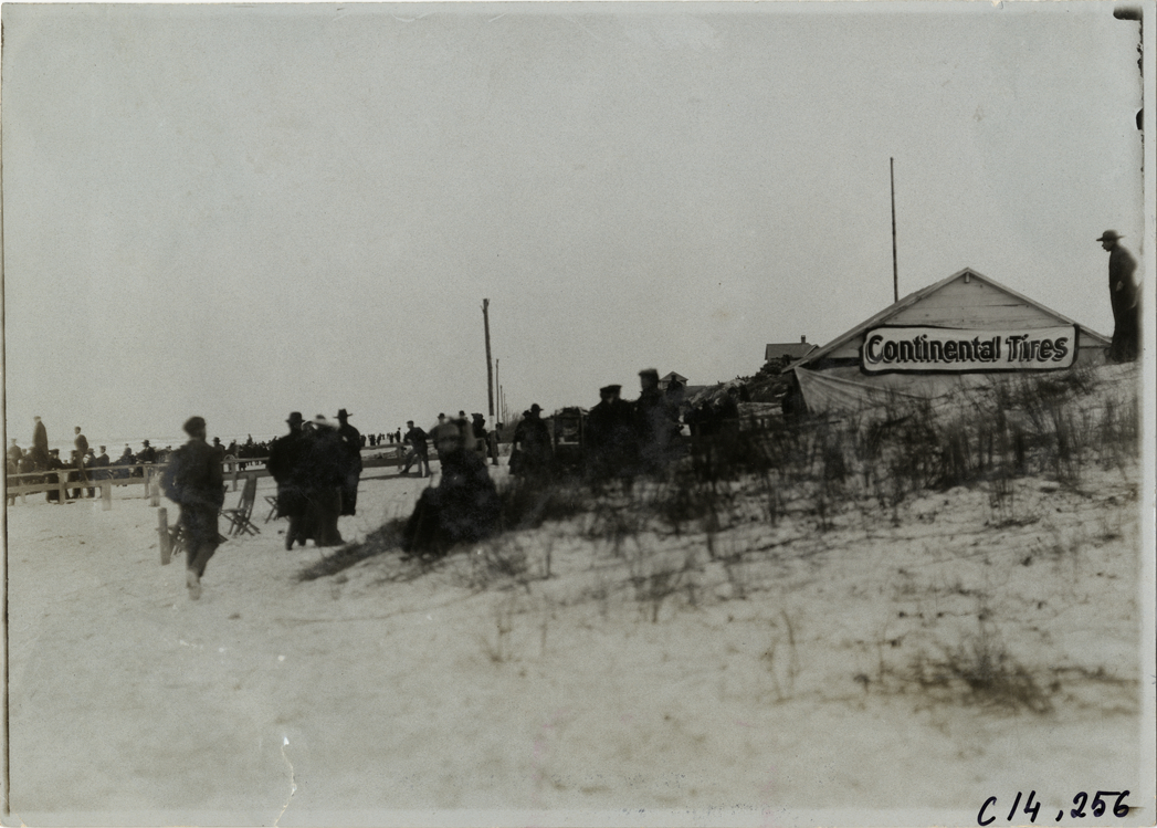View of spectators on beach during the 1905 Ormond-Daytona races in Florida. "Continental tires" banner is displayed on wooden-frame building in background. Handwritten on back: "Races and racing--Ormond-Daytona, 1905."
