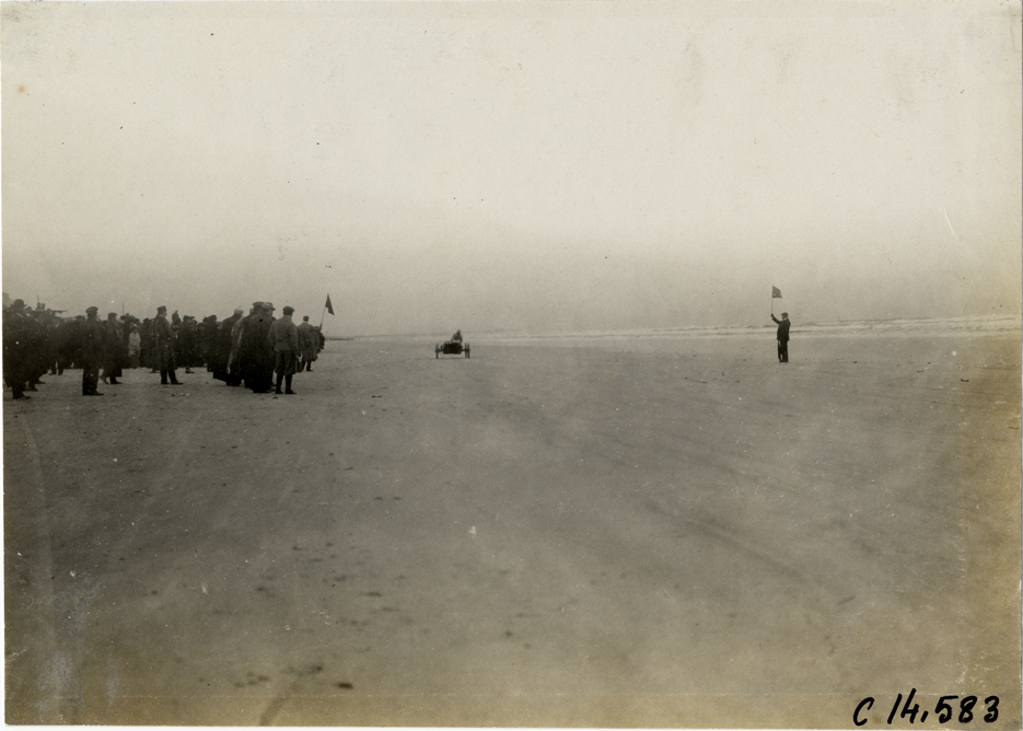 View of spectators watching car racing on beach during the 1906 Ormond-Daytona races in Florida. Official waves flag on right. Handwritten on back: "Races and racing--Ormond-Daytona, 1906."