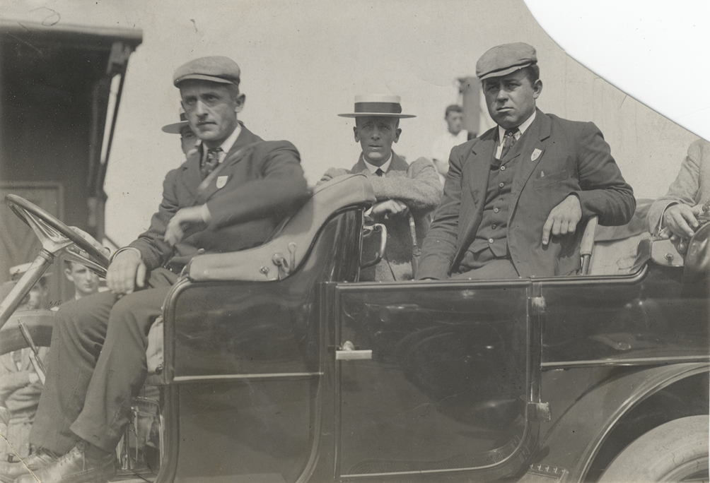 Close-up view of men in car during 1908 New York to Paris Race. Handwritten on back: "Races and racing--New York to Paris, 1908."