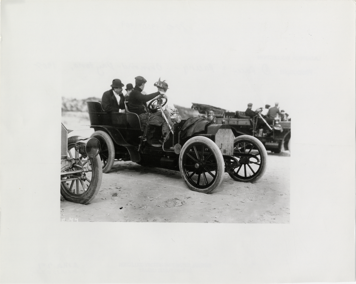 View of spectators in car on beach during the 1908 Ormond-Daytona races in Florida. Other cars are parked nearby. Handwritten on back: "Races and racing--Ormond-Daytona, 1908."